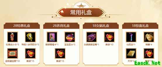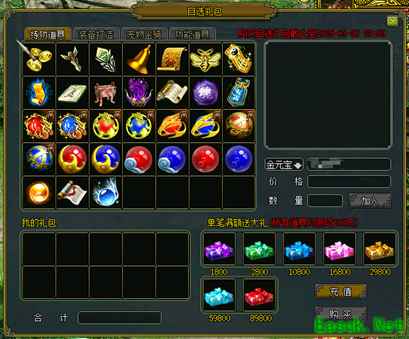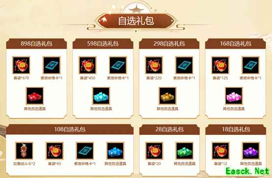 玩家可以根据自己的游戏需求,选择自选礼包商城里的物品,自由搭配同种类的道具,只要所选道具的价值满足相应“自选礼包类型”的要求,当价格达到1800元宝、2800元宝、10800元宝等不同档次时,就可以将所选道具打包成相应的礼包,并且还能获得相应的赠品。