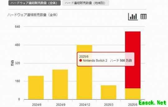 近日据任天堂官网提供的数据显示,Switch2主机在发售首月(6月),全球累计销量达500万台。远超2017年Switch发售首月274万台记录。