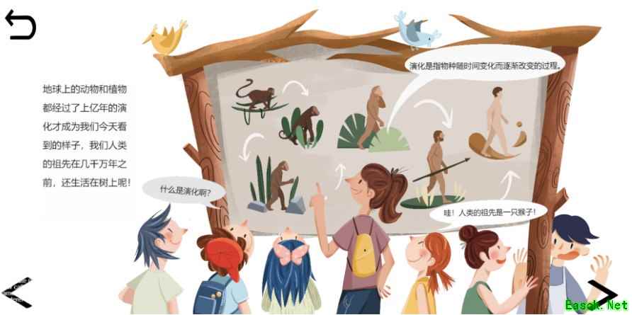 针对儿童所设计的关于人类演化的科普游戏,讲述了主人公小宇在博物馆迷路之后遇到一只神奇的小猴子,小猴子带着小宇观看了人类演化故事,并最终指引他走出博物馆。