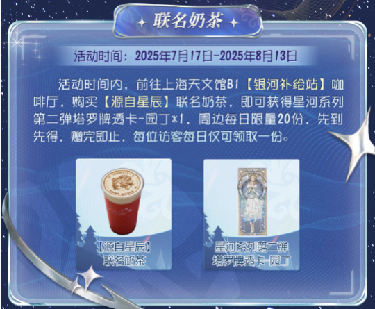 与此同时,在7月17日-8月13日期间,前往上海天文馆B1【银河补给站】咖啡厅,购买【源自星辰】联名草莓奶盖茶,还可获得星河系列第二弹塔罗牌透卡-园丁,周边每日限量20份,先到先得,赠完即止。