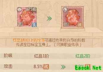 4、宝玉的升阶可以传承红玉的等级,若前期因条件限制升阶了品质较低的宝玉,后期获得更好的红玉时,可选择传承功能,将旧玉的阶数转移到新玉上(传承完成后旧玉将消失)。需要注意的是,传承操作支持跨职业和跨阶级进行。