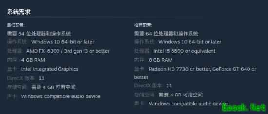 Steam商店页面也公开了本作的官方推荐的PC系统要求