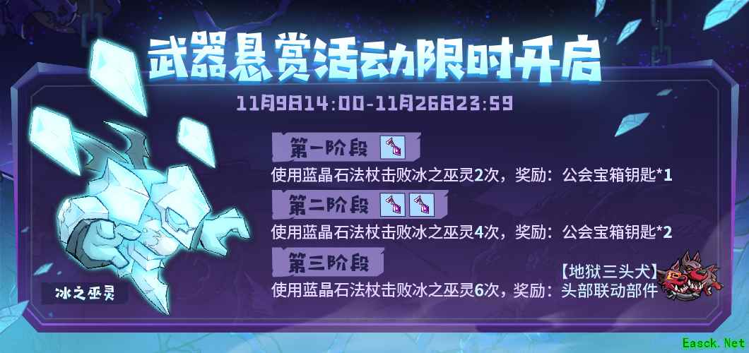 第三阶段:使用蓝晶石法杖击败冰之巫灵6次,奖励:【地狱犬三头犬】头部联动部件