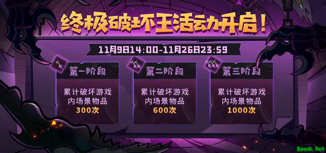 第三阶段:累计破坏游戏内场景物品1000次,奖励:公会宝箱钥匙*3