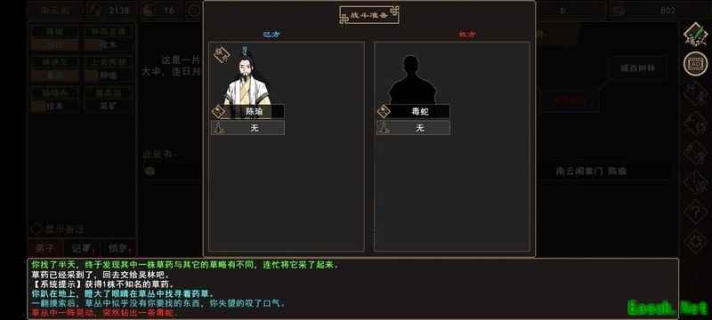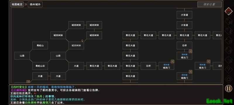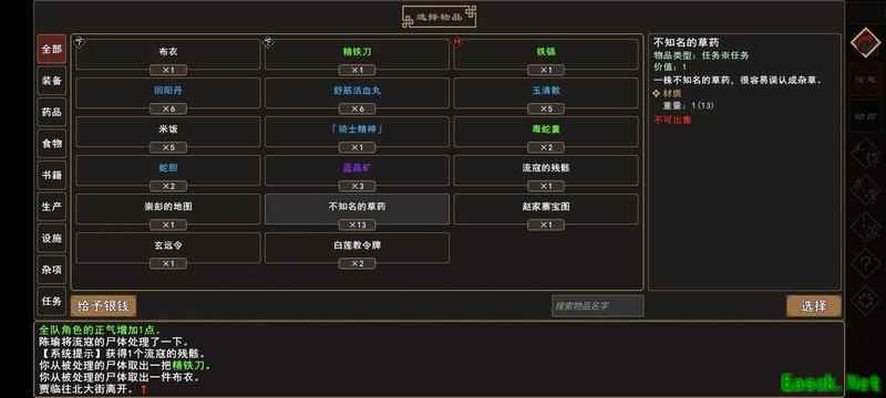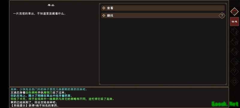前往扬州城外的城西树林草丛,选择翻找可获得不知名的草药※任务道具。建议在体力耗尽前暂停采集,以节省时间。翻找时可能随机刷出毒蛇或流寇,触发战斗,可利用多次存档进行SL刷取。