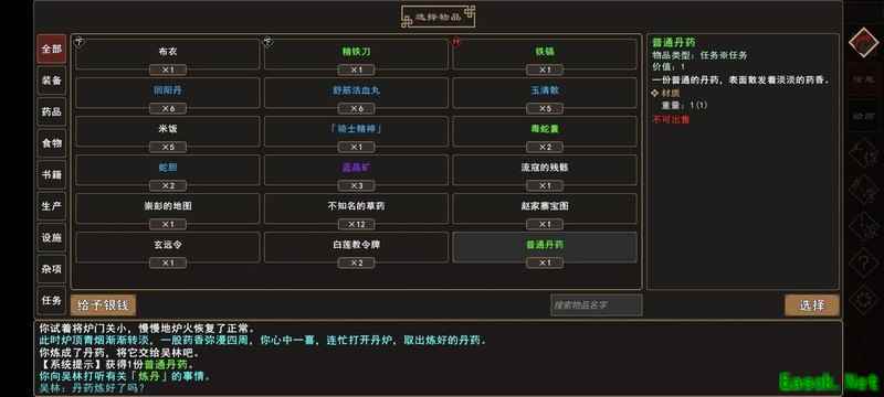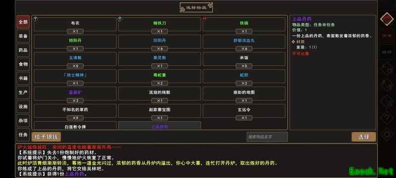 前往炼丹房,操作丹炉进行炼丹,根据提示选择对应颜色选项(与吴林对话可获取炼丹火候提示),有机会获得普通丹药或上品丹药(任务物品),炼制失败时可能扣除100银钱。