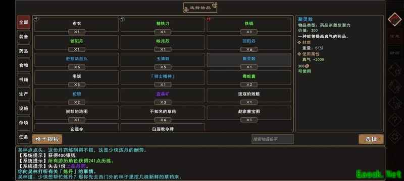 (5)[人物:药铺伙计 吴林]对话选项,可选择给予[普通丹药]或[上品丹药]完成任务。选择[普通丹药]将获得:①[银钱]×150,②全队历练 100+,③小概率掉落[聚灵散]及其他药品;选择[上品丹药]则奖励:①[银钱]×400,②全队历练 200+,③小概率获得[聚灵散]及其他药品。