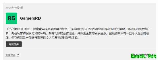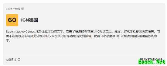 Supermassive Games成功诠释了该系列的阴森美学,怪物设计与视觉亮点尤为出色。然而,拖沓的内容填充、不稳定的节奏把控,以及仅支持线上联机却未能发挥其特色的合作模式使得本作的游戏体验收到了影响,《小小噩梦3》最终未能达到前作紧凑精妙的水平。