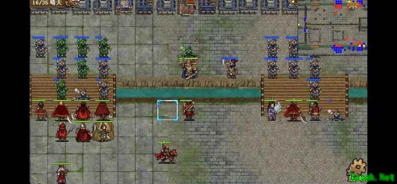 西南桥战术:第8回合由曹仁上桥吸引敌方火力,贾诩施加中毒效果,曹操控制凌统以防马岱登场后爆发连击秒杀曹仁,第二动为庞德附加强行状态。之后持续上毒、补血并控制凌统。第10回合马岱被曹洪引开后,释放凌统,利用毒伤与天雷击杀。约14回合时保留三四名长枪兵,隔河引至中路布防。